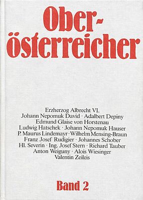 Rudolf Zinnhobler, Der heilige Severin (-482). Apostel von Noricum; Alois Zauner, Erzherzog Albrecht VI. (1418-1463). Erbfürst des Landes ob der Enns; Johann Lachinger, P. Maurus Lindemayr (1723-1783). Priester, Prediger und Poet; Harry Slapnicka, Franz Josef Rudigier (1811-1884). Bischof im Kampf mit dem politischen Liberalismus; Hans Zeinhofer, Dr. h. c. Ing. Josef Stern (1849-1924). Pionier der Elektrizitätswirtschaft; Peter Kammerstätter, Anton Weiguny (1851-1914). Sozialdemokrat der ersten Stunde; Gustav Otruba, Ludwig Hatschek (1856-1914). Erfinder und Großindustrieller; Harry Slapnicka, Johann Nepomuk Hauser (1866-1927). Landeshauptmann in der Monarchie und Republik; Wolfgang Sperner, Valentin Zeileis (1873-1939). Interessante Heilungsmethoden aus Gallspach; Isabella Ackerl, Johannes Schober (1874-1932). Mann der Mitte; Peter Broucek, Edmund Glaise von Horstenau (1882-1946). Generalstabsoffizier, Historiker und Anschlußpolitiker; Dietmar Assmann, Adalbert Depiny (1883-1941). Neubesinnung auf Heimatpflege und Volksbildung; P. Nivard Frey, Alois Wiesinger (1885-1955). Abt, Missionar, Wissenschaftler; Wilhelm Formann, Richard Tauber (1892-1948). Unsterbliche Stimme aus Linz; Josef Friedrich Doppelbauer, Johann Nepomuk David (1895-1977). Der große Kontrapunktiker des 20. Jahrhunderts; Leopold Temmel, Wilhelm Mensing-Braun (1899-1967). Superintendent in schwerer Zeit